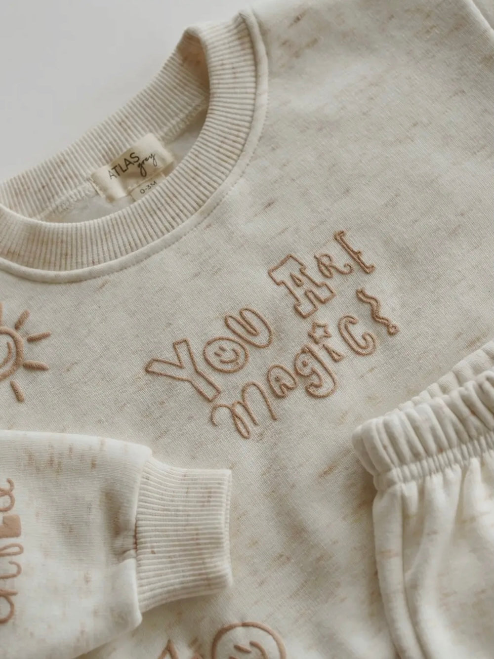 Embrace the enchantment of childhood with our You Are Magic Sweatpants , where each piece is sprinkled with whimsical sayings and designs to inspire your little ones. This set is crafted from a comfortable blend of 35% cotton, 61% polyester, and 4% spandex, offering the perfect mix of softness, durability, and just enough stretch for all-day play.